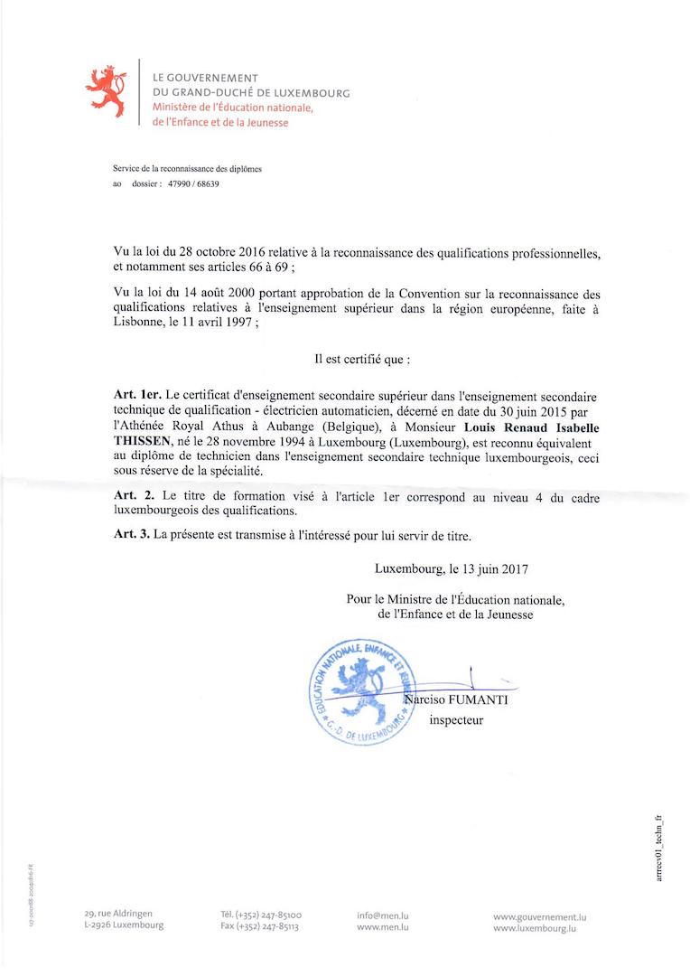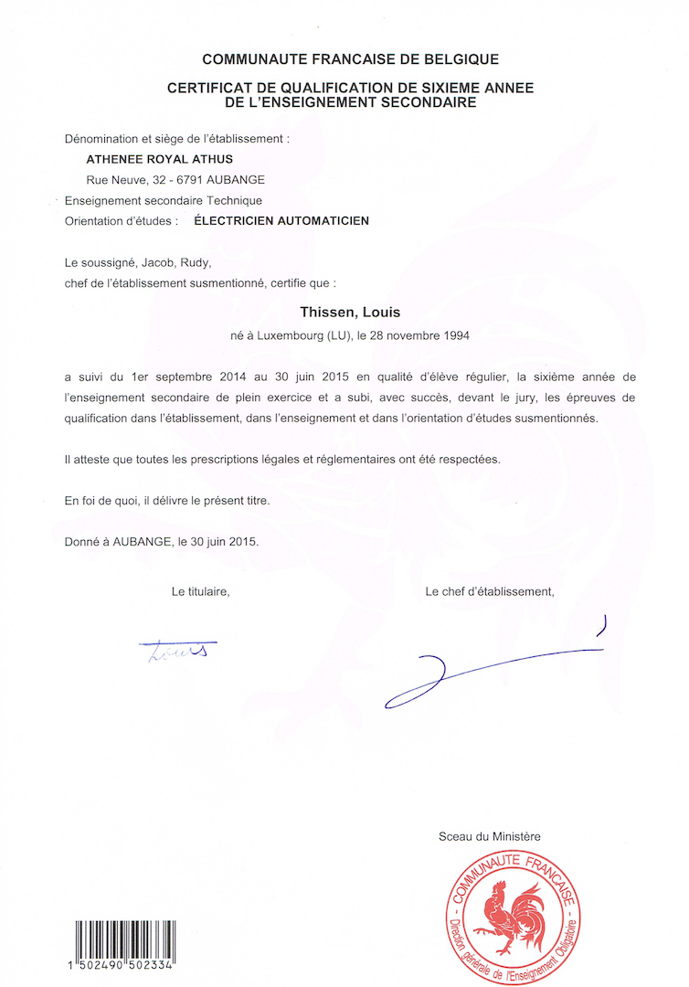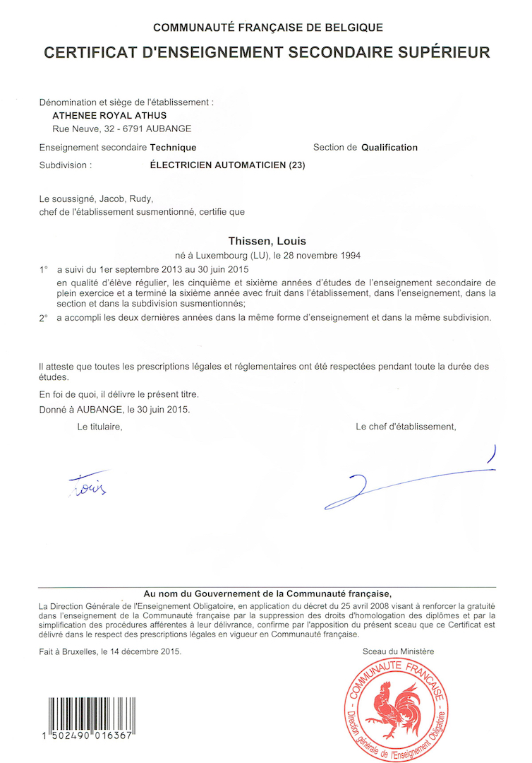 | 2013-2015 | 5ème et 6ème technique électricien automaticien Athénée Royal d'Athus |